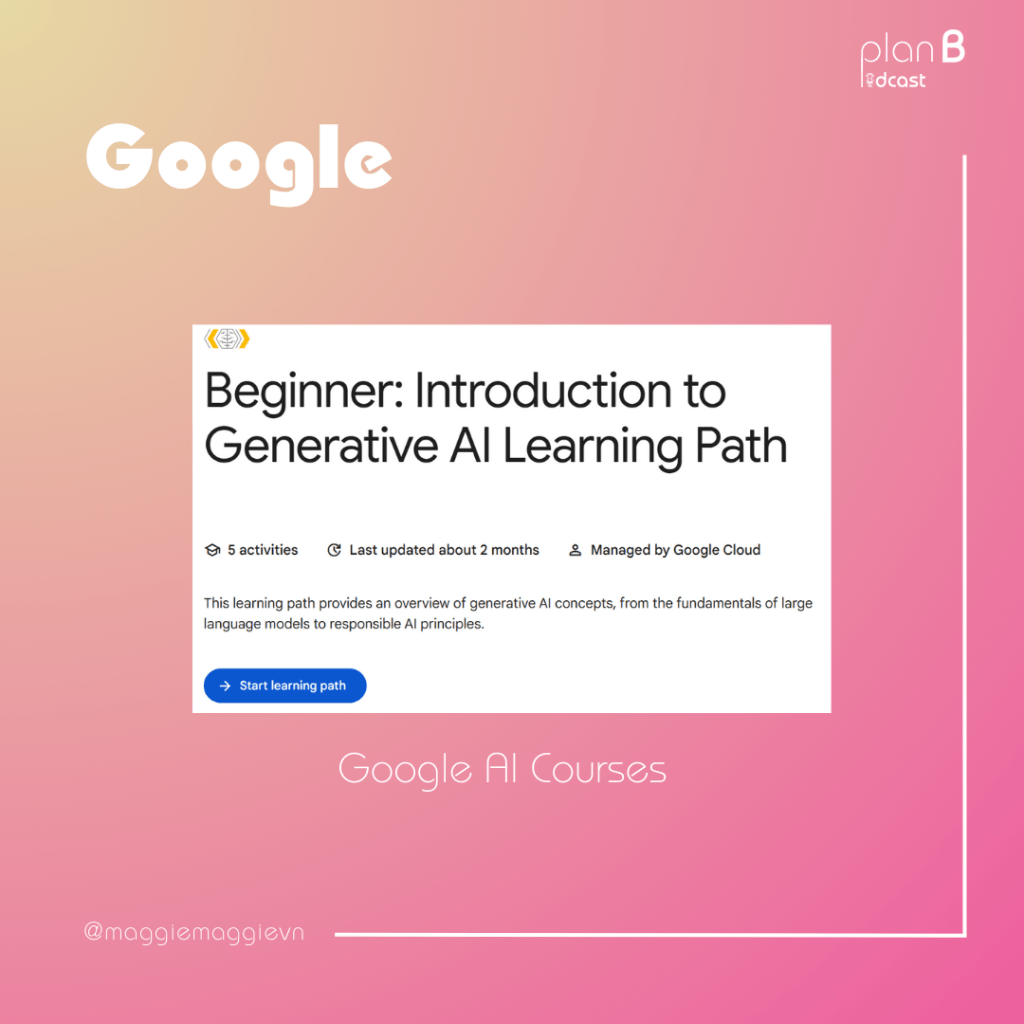– 5 khóa học từ cơ bản đến nâng cao về AI và được nhận chứng chỉ từ Google: https://www.cloudskillsboost.google/paths/118